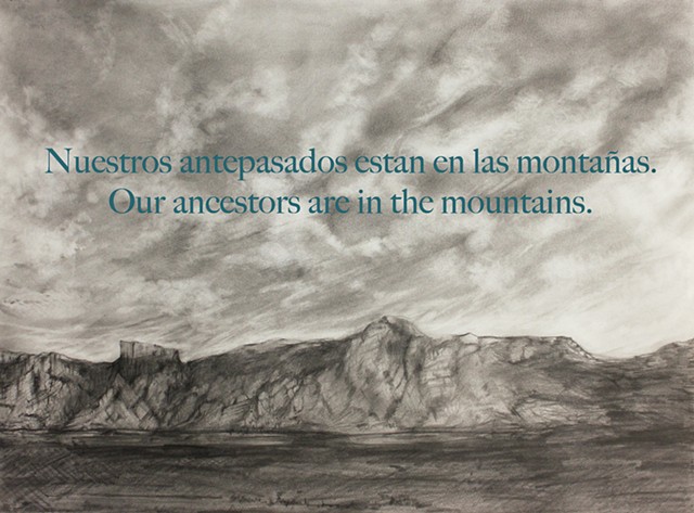 Layered over the image is a bilingual phrase: Nuestros antepasados están en las montañas / Our ancestors are in the mountains. The soft blue serif text floats gently across the sky, acting as a spiritual bridge between the land and the viewer. For me, this phrase embodies a profound cultural reverence for the natural world as a repository of memory, identity, and ancestral presence. The mountains are more than geological formations; they are sacred spaces, guardians of history, and silent witnesses to the passage of time.